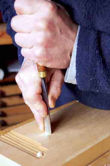 You can see the stop cut in action clearly in a medieval decorative element called a thumbnail (or fingernail): Make a strong vertical stab cut with a deep gouge and mallet at one end of the fingernail — this is the stop cut. Scoop up to this with the same gouge. It’s easiest to work across the grain and you may have to cut the thumbnail itself with a few passes. Try making the scoop cut first. You’ll see the bevel of the tool wedges the wood fibers up and forward and finding a precise place to end the cut is difficult. Thus we place the stop cut first to control this wedging effect.