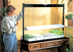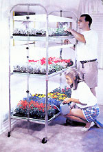Gardener’s Supply Company offers an aluminum, 68-inch-high, two-shelf unit. The unit comes with removable casters for easy moving. Each shelf holds two seedling flats under a continuously adjustable, 48-inch, 2-tube fixture. They also offer the 54-inch-wide tabletop model. It includes a hanging, two-tube light fixture. Available from Gardener’s Supply Company; 128 Intervale Rd.; Burlington, VT 05401; 800-876-5520.
