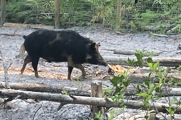With dogs and manpower, Davis and his team relocate hogs to a 1-acre fenced area located on The Farm. They only cleared enough of the wooded lot to securely add a perimeter fence. The inside of the pen consists of intact woods so thick that Davis says you sometimes can’t see the hogs in the pen. The wooded enclosure provides the hogs with a feeling of protection and privacy.
