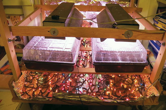 A friend named this my “Christmas tree light farm.” I’ve been using this setup to start my seeds for four years now. Grow lights hang from a wooden rack and strands of holiday lights rest below my seed-starting trays to heat the soil (not touching the trays, but nested right below them). I stick a thermometer in the soil to monitor its temperature. — JoAnn Hana