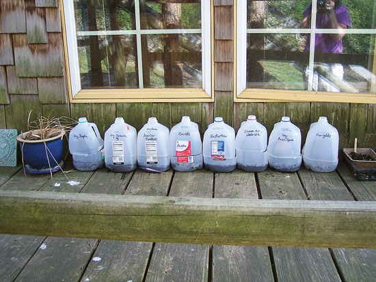 I fill the jugs with soil mix and place nine to 16 seeds in each jug, depending on plant size. In early spring, I keep the jugs inside in front of a southwest-facing window, and then move them outdoors when the weather starts to warm. When I transfer the seedlings to the garden, I simply scoop them out with a large serving spoon, taking care to bring as much soil with each plant as possible to limit root disturbance.