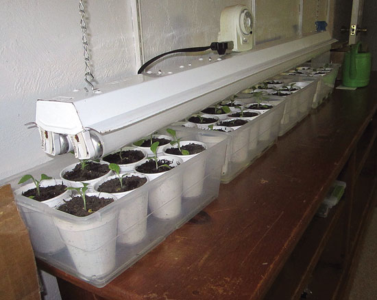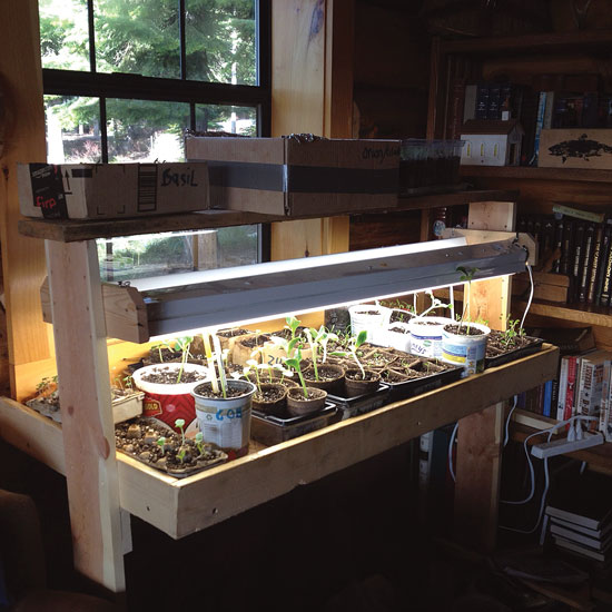 I built my grow-light stand last year using ash wood from my backyard that I cut on my bandsaw mill. The stand has two levels, and it’s equipped with shop lights and bulbs I purchased at Home Depot. The bulbs are Phillips ALTO T8s, which put out about 2,750 lumens. I’m able to adjust the fixture height to keep the bulbs within a couple of inches of the plants for best results. This stand easily disassembles for storage, and I can also move it around because I built it on wheels. It works so well that I use it to grow lettuce indoors when I’m not starting seedlings. — Edward Hollmen