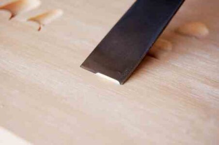 Slice from left to right and from right to left. Keep the area clean as you go along. It’s tricky at first not to dig the corners in. If you do, immediately go over the torn grain and repair the surface.