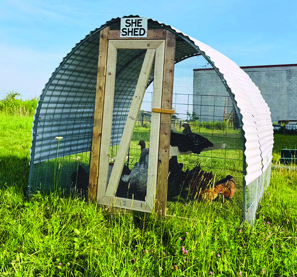 Eggs taste better when my chickens can hunt and peck in the grass, and it saves on feed costs too. However, I’m a teacher and am busy supervising kids, so I can’t watch my chickens as they free-range during the day. We have a lot of predators, such as coyotes and foxes, that would snatch my birds up while I was away. I decided to try a movable chicken tractor. Working with limited funds, I made use of what I already had available. This chicken tractor is made of three cattle panels, some 3/4-inch electrical conduit, scrap 2x4s, and 1/2-inch wire-mesh fencing, all held together with self-tapping metal screws. The flexible plastic roofing makes it light enough to drag from place to place so that my flock can have fresh grass every couple of days.