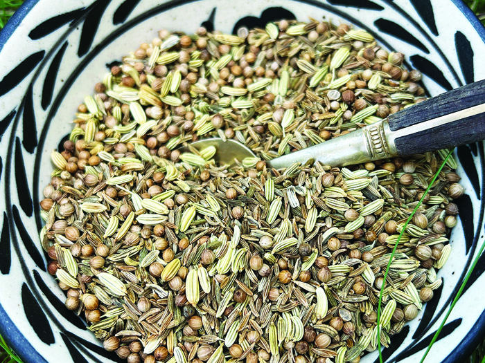 Combine equal parts by volume of whole cumin, coriander, and fennel seeds. Lightly toast the seeds in a dry skillet until they become aromatic and turn slightly golden in color. Allow to cool and then store in an airtight container for later use. To make the tea, place 1/2 to 1 teaspoon seeds per cup of water into a pot and bring to a boil for 5 minutes, then strain. During the cooler months, I like to add a slice of fresh ginger root to the pot while it boils for added warming properties. I like to drink 1/4 to 1/2 cup of tea with meals as an aid for good digestion, or consume it anytime to ease digestive discomfort.