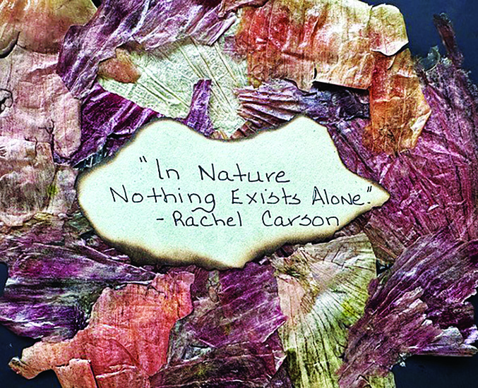 Next, I lightly coated the bottom of a heavy skillet with corn oil and placed it on top of the onion skins. The weight flattened the skins and the oil kept them from sticking. By the next day, the skins were flat. Using the tip of my finger, I smeared a thin layer of hobby paste over them. The paste dried clear and shiny. The skins were now strong enough to use as a canvas. You could add dried herbs to create more dimension, paint some wildflowers on the canvas, or, as I’ve done here, add a meaningful quote.