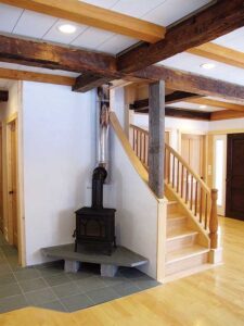 To achieve flood resilience, we trenched on the uphill side of an old outbuilding that we’d just restored against a hillside. This trench captures moisture coming downhill during an intense storm or spring runoff when the ground is still frozen. Free-draining stone and drainage tile below should keep the building dry. We also put in similar drainage on our 1812 barn, which had suffered moisture damage in the past.