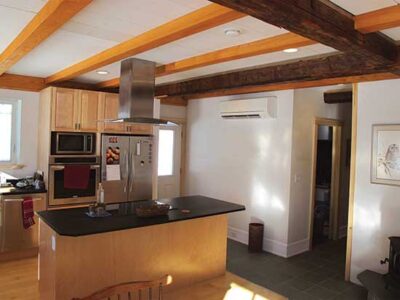 At our own resilient homestead, Leonard Farm, we did a major renovation of the 200-year-old farmhouse, creating 1-foot-thick walls and adding a new roof with 16-inch-deep rafters. For our walls, we framed in with 2-by-3s to create a 7-inch cavity, which we filled with spray-fiberglass insulation, and we added a 6-inch layer of cork insulation to the exterior. We installed double-hung windows to complement the historic house (double-glazed with a high-solar-heat-gain, low-E coating and argon gas fill), but then added low-E storm windows on the outside of the prime windows — so we effectively have triple glazing with two low-E coatings. Our 1,500-square-foot home is so well-insulated that we heat it with a single 18,000-Btu-per-hour air-source heat pump. Even in freezing temperatures, that heat pump keeps the house warm. Though we almost never need to air-condition the house, the air-source heat pump has that capability.