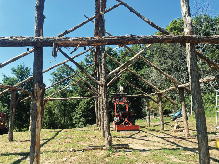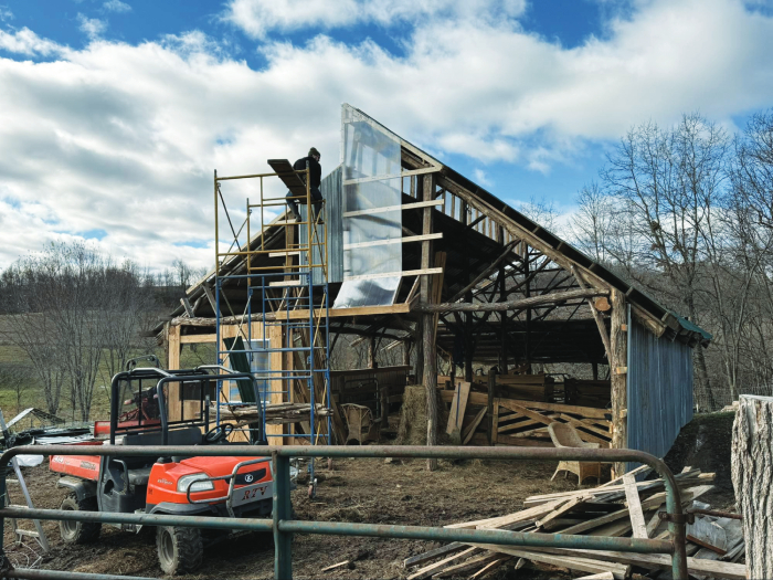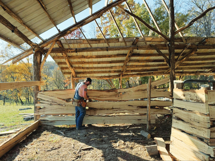 - Meet your budget. In terms of cash dollars, we spent about $2,500, most of which was on the trees themselves, the trucking to get them home, and the fasteners used to hold it all together. We bartered with the neighbor for the tin and poplar boards, and the locust lumber was milled by a friend for pennies on the dollar. It’s hard to say what you might spend to recreate this barn from all-new materials, but this layperson’s guess is in the range of $20,000, even if you did all the labor yourself. There’s immense value in getting to know the members of your community and being generous with your own time and resources – it’ll all come back to you and then some.