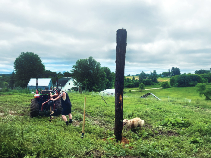 - Nothing lasts forever. Every building will eventually fall, often because the wood has rotted. Anywhere that wood is in sustained contact with soil or water will rot quickly. This especially should be considered for any wood that will be exposed to the hot, wet conditions of the bedding pack. We chose black locust for its excellent rot resistance and tendency to grow straight and tall. We sourced the trees from a friend’s farm about a half-hour’s drive away. This saved considerable money compared with buying wood from the building-supply store. Black locust is hard to work with. It quickly dulls drill bits, breaks fasteners, and is very heavy. However, its rot resistance allowed us to place it directly in the ground, which held the poles up straight while we built. It also cut costs immensely compared with pouring concrete piers. We found that a ship auger drill bit worked well to bore holes, as it has a lead screw that takes on the heavy pulling. We’ve been told it’s best to remove the bark, coat the buried portion with a wood preservative or sealant, put a rock in the hole first, put gravel in the hole first, and other ideas that sounded good. We didn’t do any of those. Nothing lasts forever.